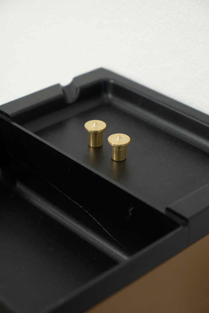Dalles de moquette plombantes, feutrine, moquette, laiton, meuble Allibert, aluminium brossé, MDF, gobelet et couvercle usagés, chewing-gum